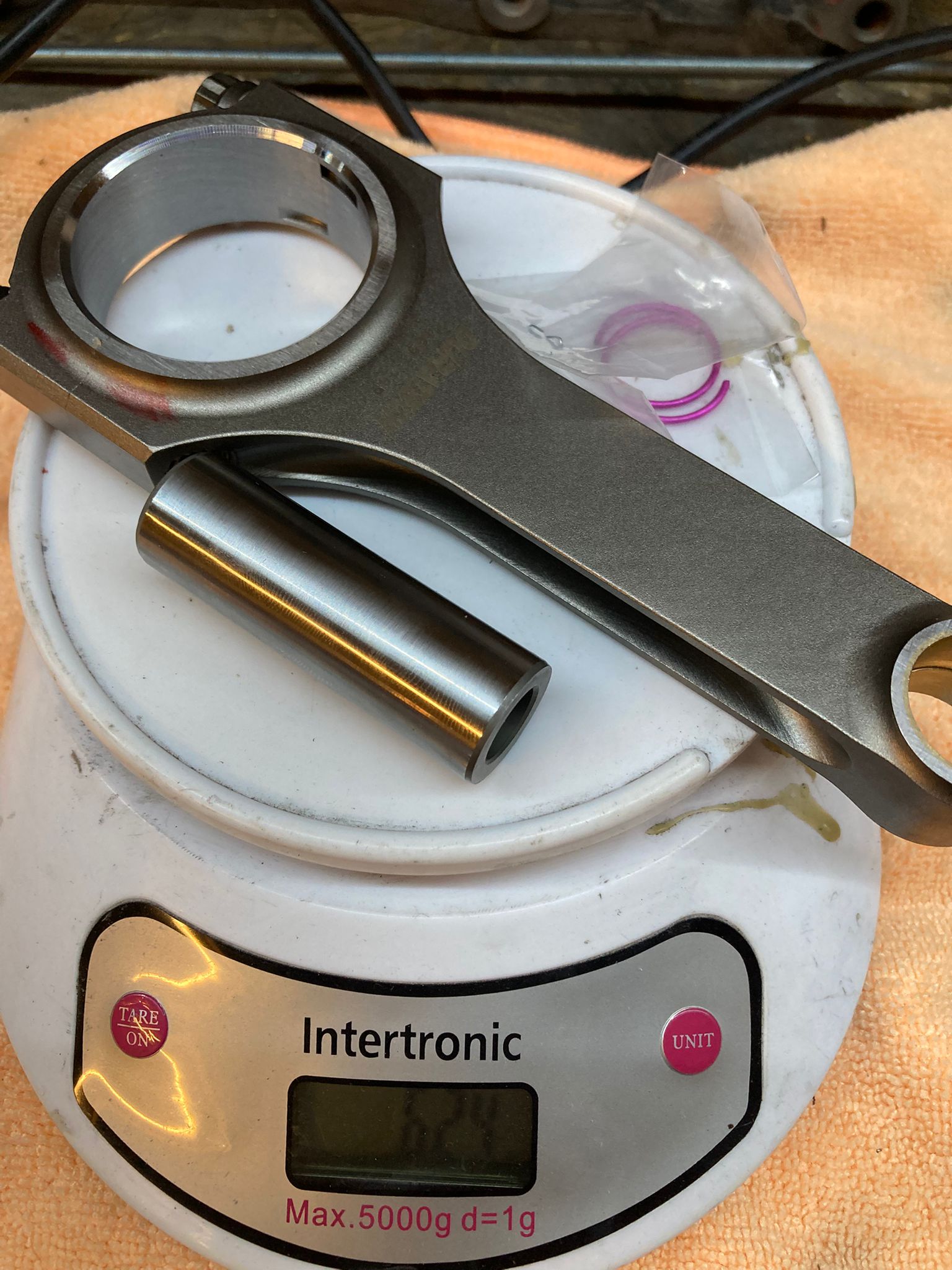 Poids de la bielle forgée (avec le pin,la visserie ARP2000 et les circlips) : 624 grammes