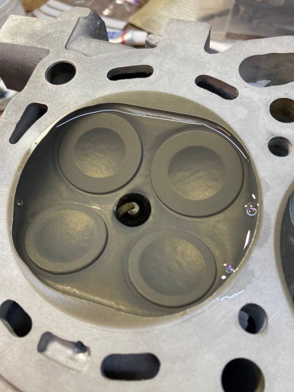 Pour vérifier l'étanchéité, j'ai simplement posé les souapapes sans ressort, monté une bougie et rempli les chambres de combustions avec de l'acétone,et....attendre.